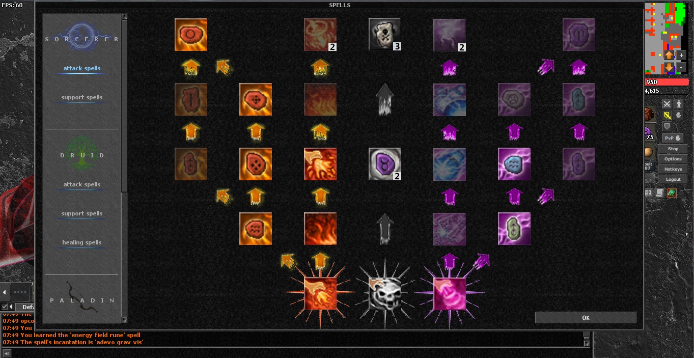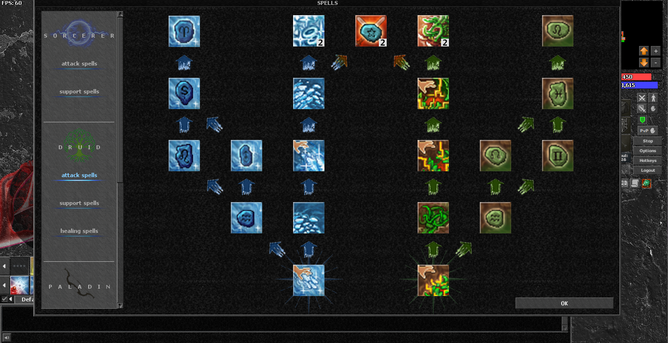 Each vocation has a unique spell progression tree. The character gains 1 spell point every 5 levels.